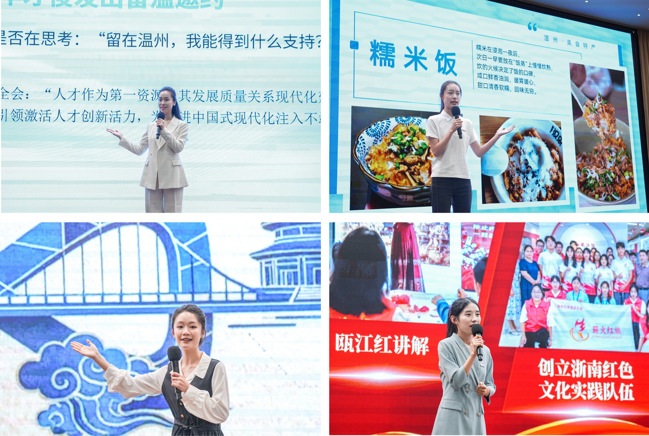 如何让党的理论从“入耳”到“入心”?来自温州机关与高校的四名青年宣讲员结合自身岗位与城市发展,作出了生动诠释。温州市人力社保局陈嫣涵生动解读了温州为高校毕业生量身定制的“510+行动计划”人才政策礼包,展现城市与人才的“双向赋能”。温州市文化广电旅游局全彤以独特的“工程”视角解读文化建设,阐释破解系统性创新性的“文化工程”中的“幸福密码”。温州理工学院“大学生留温就业促进计划市情宣讲员”陈羽茜从温州的“一碗风味、一街风情、一方山水”切入,勾勒出温州发展中的烟火气与诗意感。胡思懿同学则以中共浙江省一大陈列馆中的老物件“一支钢笔、一艘木船、一封残存家书”,诠释浙南“火种精神”。