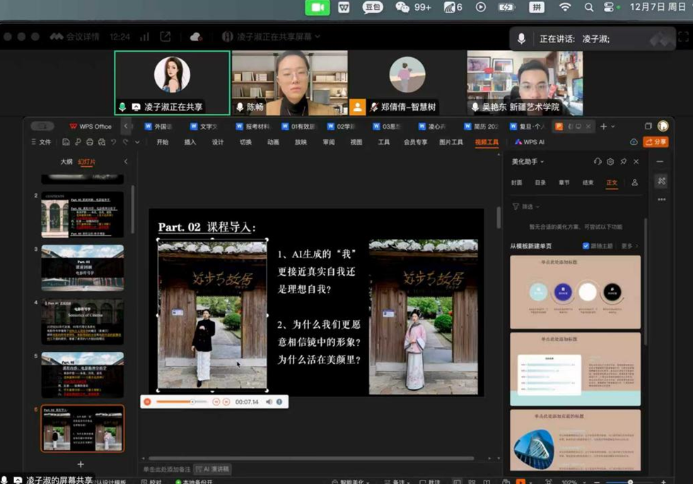 自2025年10月起,双方团队通过虚拟教研室连续开展3轮线上研讨,从课程结构设计、教学内容整合,到互动环节与科技融合手段,逐一精细打磨,构建起真正意义上的“云端协同备课”机制。值得一提的是,温理工近年来持续开展与新疆多所高校的线上教学合作,积累了丰富的跨域协同经验。本次公开课团队也积极借鉴校内以往“慕课西行”项目的成功做法,进一步优化协同流程。温理工教师陈畅、凌心卉与新疆艺术学院教师吴艳东紧密协作,打破空间限制,实现资源互通、优势互补,为高质量同步课堂打下坚实基础。