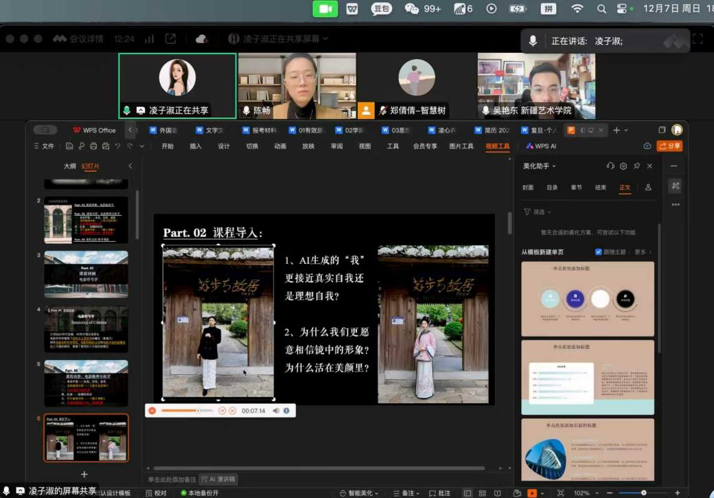 本次公开课进一步升级了温州理工学院《影视美学》课程已有的“双师型”教学模式——该模式此前已在省内课程改革中受到关注,并获得省市媒体专题报道,取得了良好的教学反响。在此基础上,本次课堂创新引入“三师协同”机制,融合温州理工学院影视理论积淀与影视创作,和新疆艺术学院地域文化分析,打造出“经典影视理论+地方特色文化+前沿行业技术”三重驱动的教学新生态。在此基础上,本次课堂以“教育协同、技术赋能、文化铸魂”为战略导向,构建跨区域教学共同体:服务“教育强国”战略,打造高水平教师协同创新机制;融入“中华民族共同体”建设,促进东西部文化互鉴共融;对接“数字中国”愿景,推进智能技术与教育教学深度融合。
