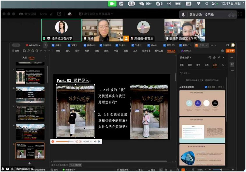 本次公开课进一步升级了温州理工学院《影视美学》课程已有的“双师型”教学模式——该模式此前已在省内课程改革中受到关注,并获得省市级媒体专题报道,取得了良好的教学反响。本次课堂创新引入“三师协同”机制,融合温州理工学院影视理论积淀与影视创作经验,以及新疆艺术学院的地域文化分析优势,打造出“经典影视理论+地方特色文化+前沿行业技术”三重驱动的教学新生态。在此基础上,本次课堂以“教育协同、技术赋能、文化铸魂”为战略导向,构建跨区域教学共同体:服务“教育强国”战略,打造高水平教师协同创新机制;融入“中华民族共同体”建设,促进东西部文化互鉴共融;对接“数字中国”愿景,推进智能技术与教育教学深度融合。